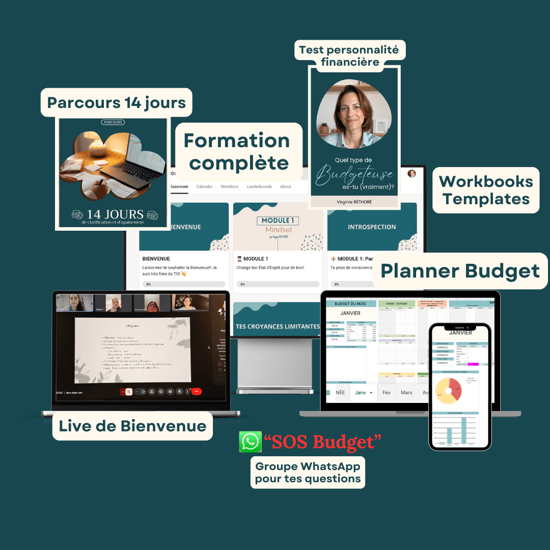 Tu accèdes à RESET-BUDGET pendant 12 mois : formation sur Skool, outils, templates et espace "SOS BUDGET".